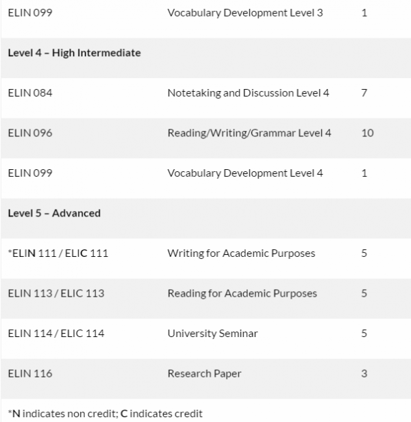 ELI 프로그램 일정은 쿼터 시스템을 기반으로합니다. 가을, 겨울, 봄, 여름에 시작되는 해에는 4번의 학기로 진행됩니다.습니.기간은 여름을 제외하고 지난 11 주, 즉 8 주입니다. 그러나 여름 방학은 15 분 더 길어 학생들은 정규 수업시간과 동일한 수업 시간을 받게됩니다. 늦은 여름 4시30분 주간 프로그램도 있습니다.