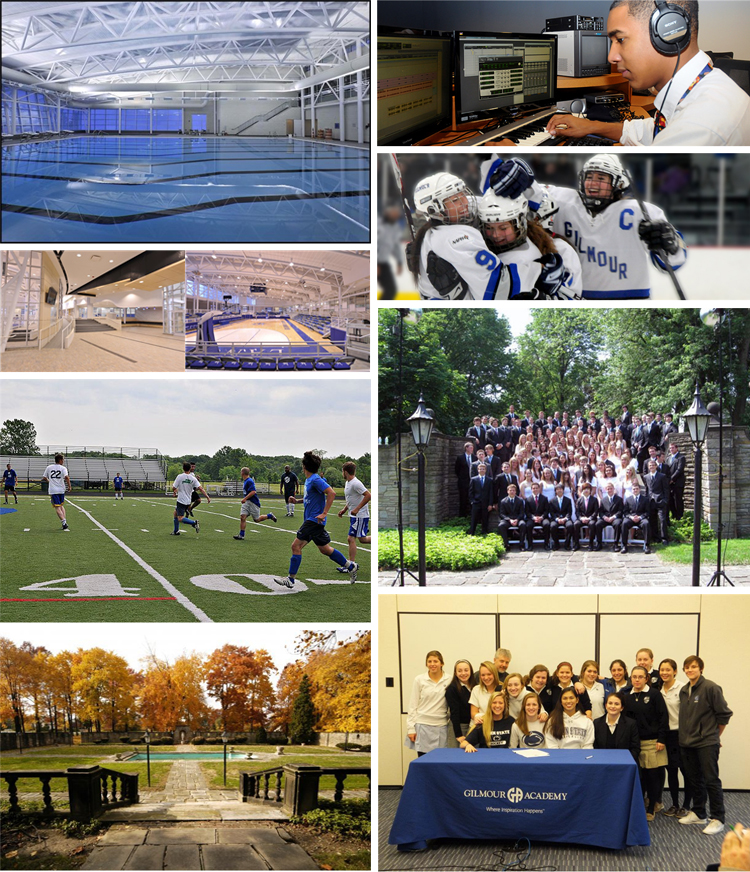 학교소개 | Gilmour Academy는 Gates Mills, Ohio에 위치하고 있으며, Cleveland 시내 동쪽에서 18 miles 떨어져 있다. Cleveland 는 미국 중심부에 위치한 매우 중요한 도시입니다. Cleveland에는 Cleveland Art Museum, Rock and Roll Hall of Fame, Museum of Natural History 박물관 등이 있습니다. 학업 프로그램으로는 14개의 AP 과목을 제공합니다. 그리고 KAP(Kenyon Academic Partnership)를 통하여 담당 선생님의 추천을 받은 높은 성적의 학생들은 Kenoyn 대학교의 수업을 들을 수 있으며, 현재 50명 이상의 학생이 이 수업을 듣고 있습니다. 전체 커리큘럼의 영어, 외국어, 사회, 수학, 과학, 종교 수업과 Honors level의 수업으로 Gilmour Academy에서 방송저널리즘, 신문 저널리즘, 시각예술, 중국어, 아랍어, 기초 함수, 해양물리학, 생명공학, 기초 건축학, 패션디자인의 과목의 수업을 제공합니다. Catalyst Program은 리서치 바탕의 한 학기 학외 연수 프로그램으로 학생들이 병원, 박물관, Case Western대학교의 멘토와 함께 관심분야의 리서치를 합니다. 최근에는 분자생물학, 공학, 심리학, 컴퓨터과학, 천체물리학, 예술 보존 관리 분야로 늘어났습니다. 학교는 국제학생들을 위해 국제학생 학업지원 프로그램을 제공합니다. 학교에 지원한 국제학생들에게 높은 영어실력을 요구하며, TOEFL시험을 보도록 권장하고 있습니다. 특별활동으로는 40개의 클럽, 특별활동, 15개의 스포츠 활동에 참여할 수 있습니다. SAT 평균점수는 1704점으로 졸업생의 대학진학률은 100% 입니다. 졸업생이 진학한 대학은 다음과 같습니다. Brown University, Carnegie Mellon University, Case Western University, University of Chicago, Columbia University, Cornell University, Dartmouth College, Duke University, Emory University 등. |